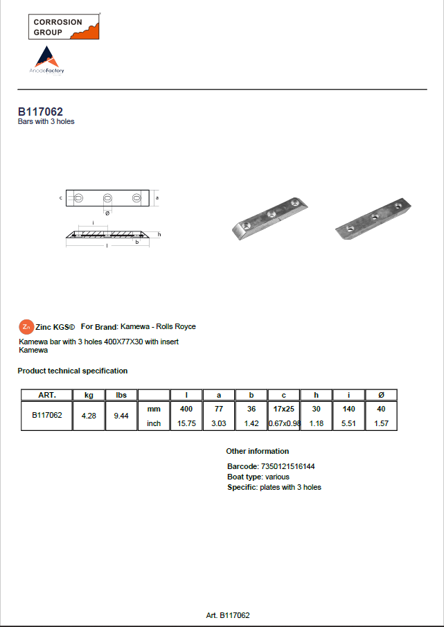 Zinkanod KGS© Kamewa/Rolls Royce RRM000260003A 400x75x30 mm, 4,9kg 117062
