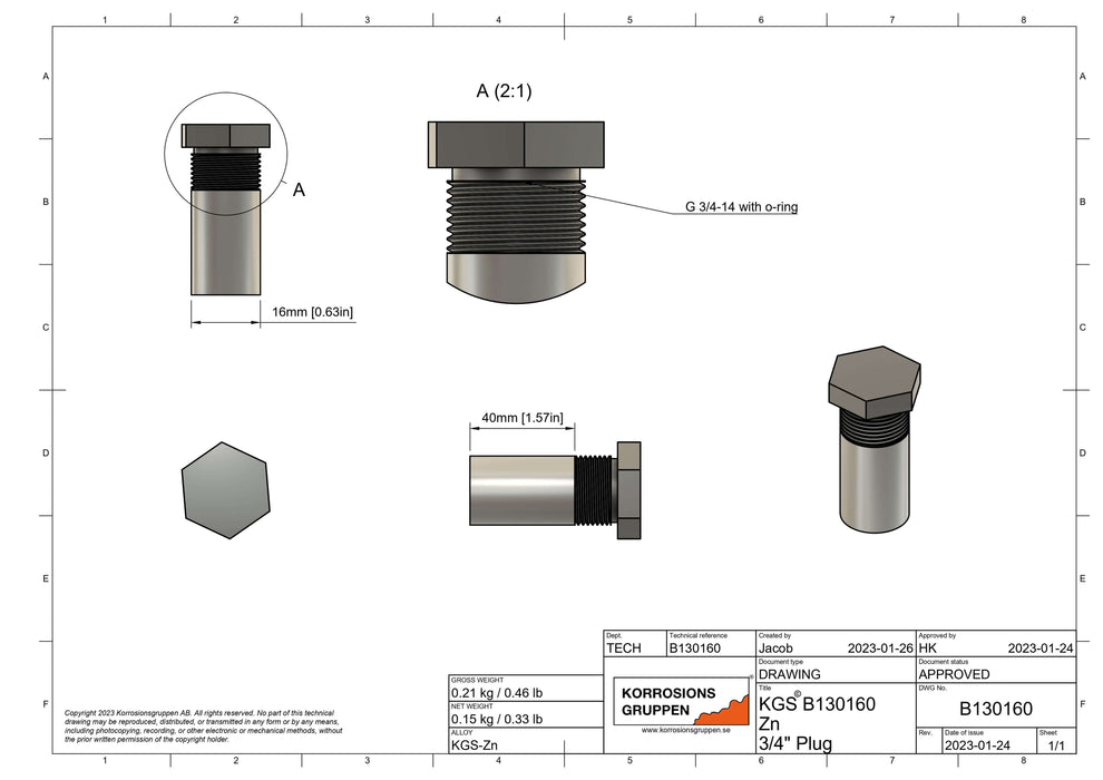 Zinkanod med 3/4" stålplugg, ø16*40mm / ø0.63in*1.57in
