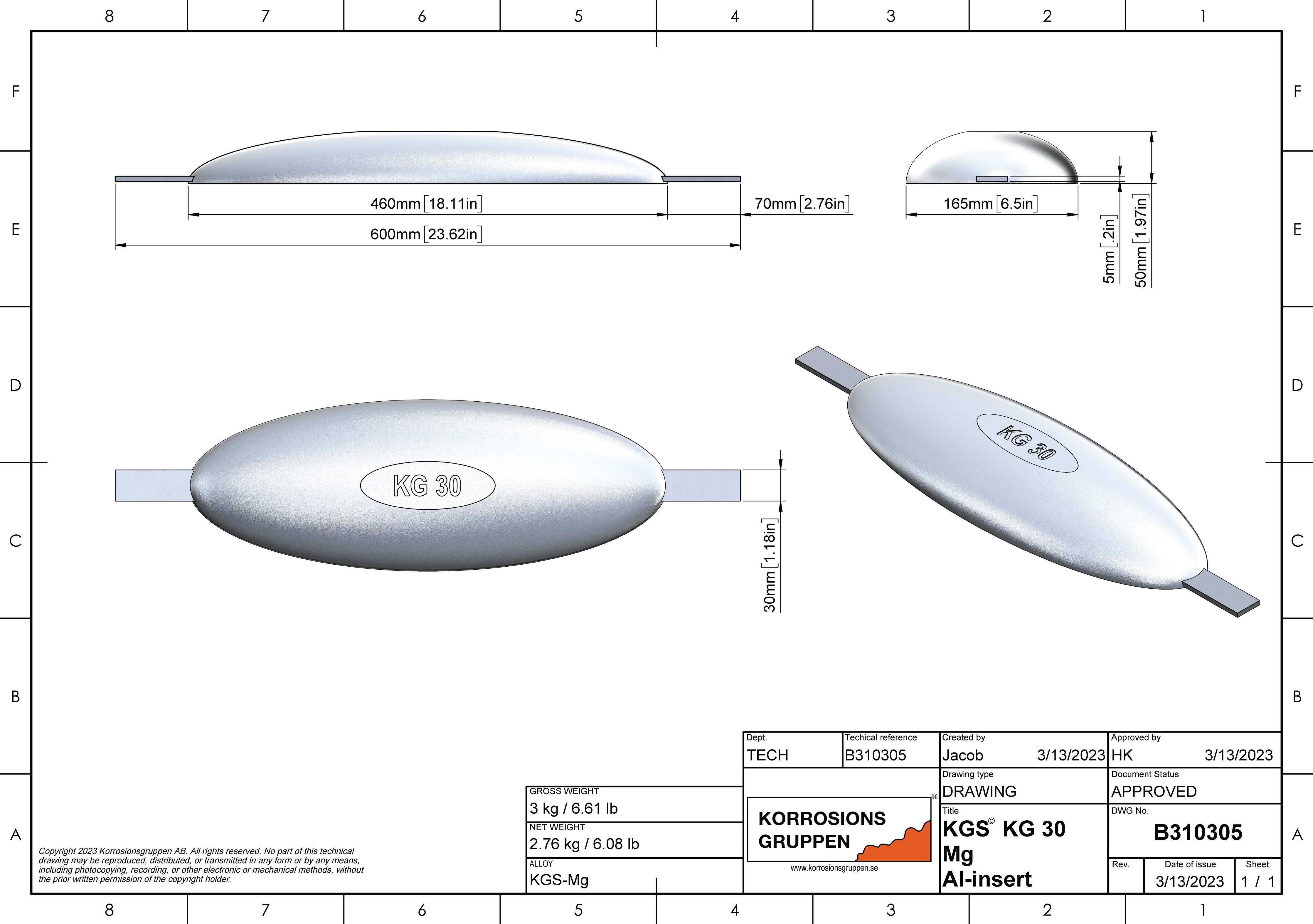 Ánodo de magnesio TIPO 30 AL- 460*165*50, (600mm), aproximadamente 3,24kg/7,14lb. AZ63-1,5VDc