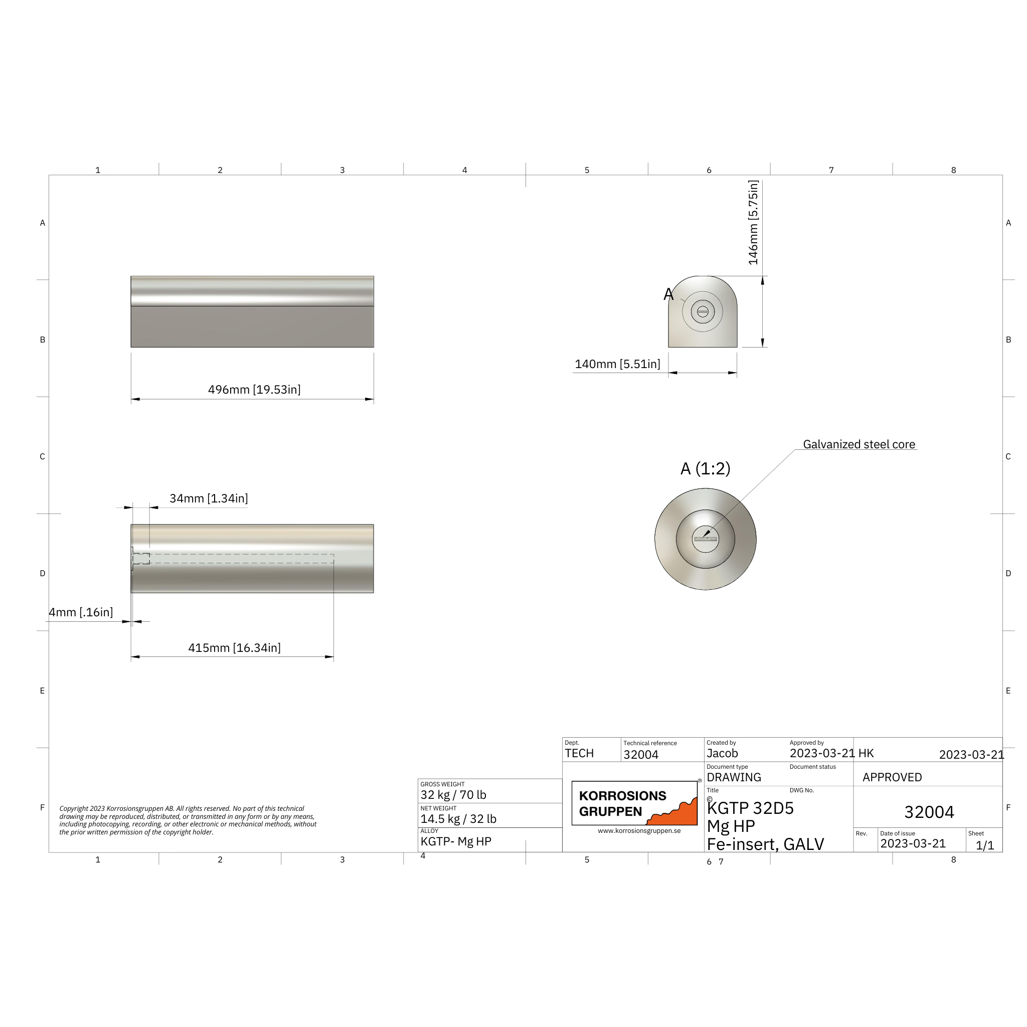MG-ANODE IN BACKFILL 14,5 KG/32lbs, 1,7V, inkl 3m, 10mm2 rojo XLPE/PVC
