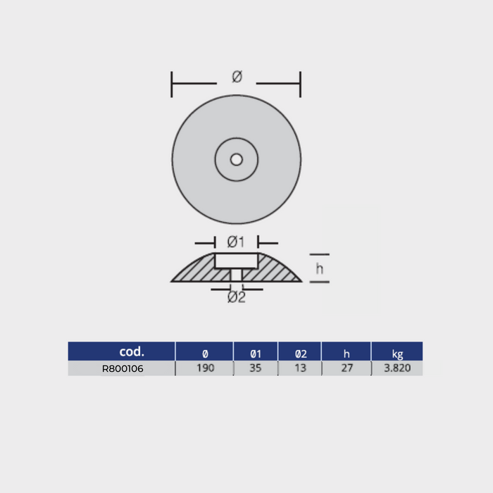 Ánodo de zinc para timón - 190 mm DIÁMETRO, 3,82 kg