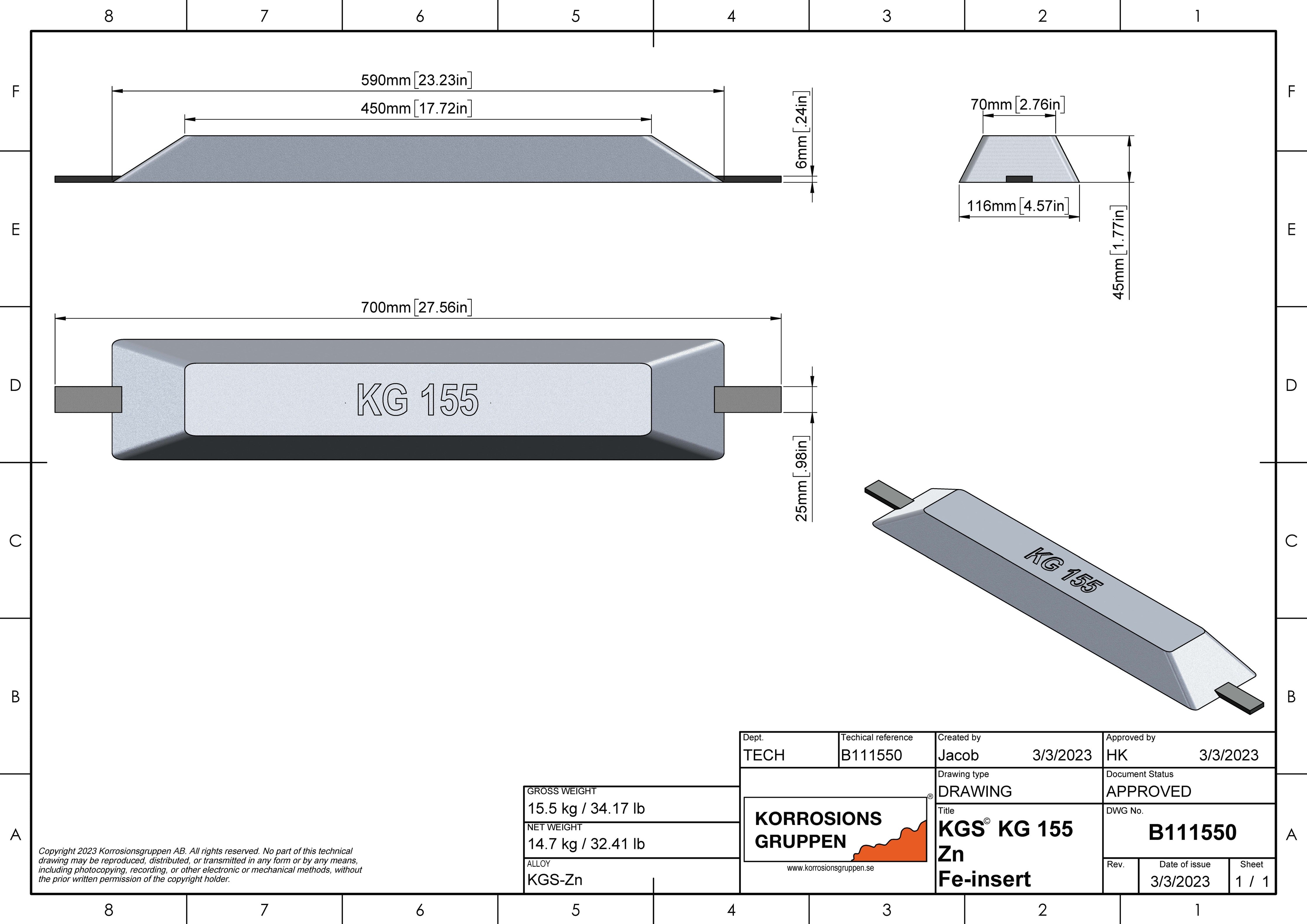 Ánodo de zinc TIPO 155 - 590*116*45, B111550